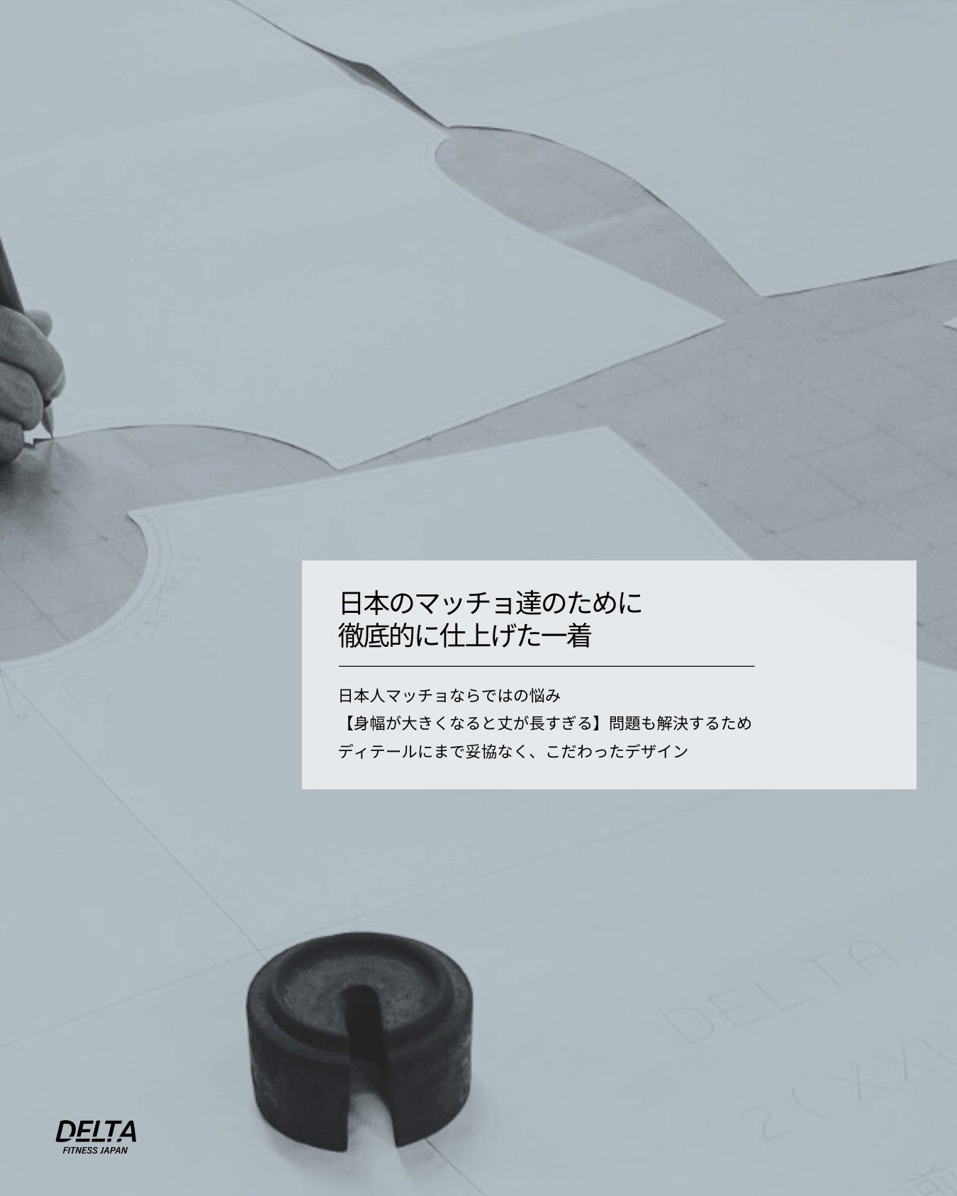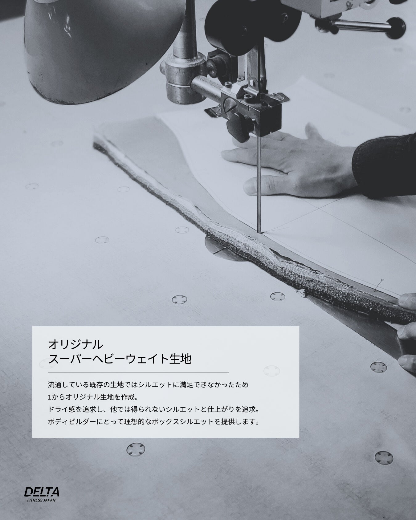 流通している既存の生地ではシルエットに満足できなかったため、1からオリジナル生地を作成。ドライ感を追求し、他では得られないシルエットと仕上がりを実現しました。ボディビルダーにとって理想的なボックスシルエットを提供します。