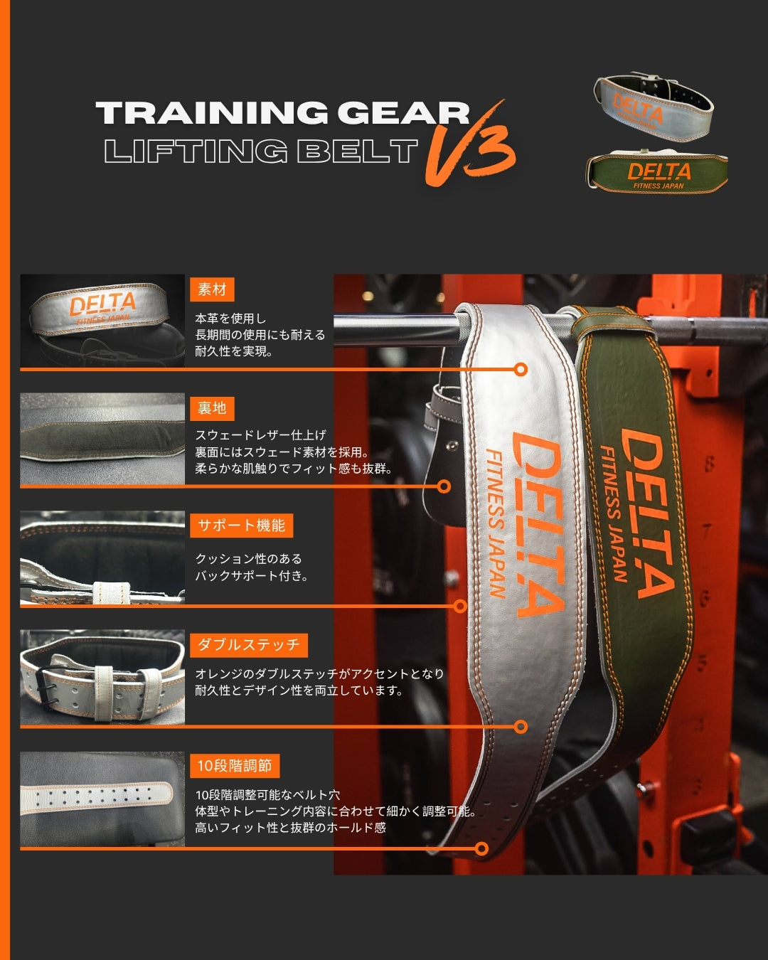 DELTA FITNESS オリジナル レザーリフティングベルトV3は、プロフェッショナル向けに設計された高品質な本革トレーニングベルトです。ハードなトレーニングに対応し、腰をしっかりとサポートするバックサポート付きで、安全かつ快適なトレーニングをサポートします。さらに、デザインにもこだわり、オレンジのダブルステッチがアクセントとなり、耐久性とデザイン性を兼ね備えたアイテムです。